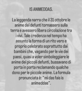 Legend has it that on October 31, the souls of the deceased returned to earth and had free movement among the living. Over time, this belief has taken the form of a real ritual celebrated above all by children who, wandering through the streets of the villages, as if to symbolize the souls of the deceased, knocking on doors and asking for some gifts for the little souls. The phrase that is said is: “mi das fais is animeddas” (give us something for the souls)